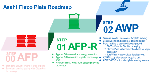 More than 70% of flexo plate producers use solvent-wash plate processing. In an ideal world, plate processing would migrate to water-wash plates, eliminating the need for solvent use and reducing the plate processing environmental footprint. At Asahi Photoproducts, we have those solutions. But we also understand that in today’s turbulent economy and competitive marketplace, it is not always easy to make the investment in new equipment to take this step. That’s why we have created a bridge product to help flexo plate producers begin their journey on the Road to Solvent ZERO.