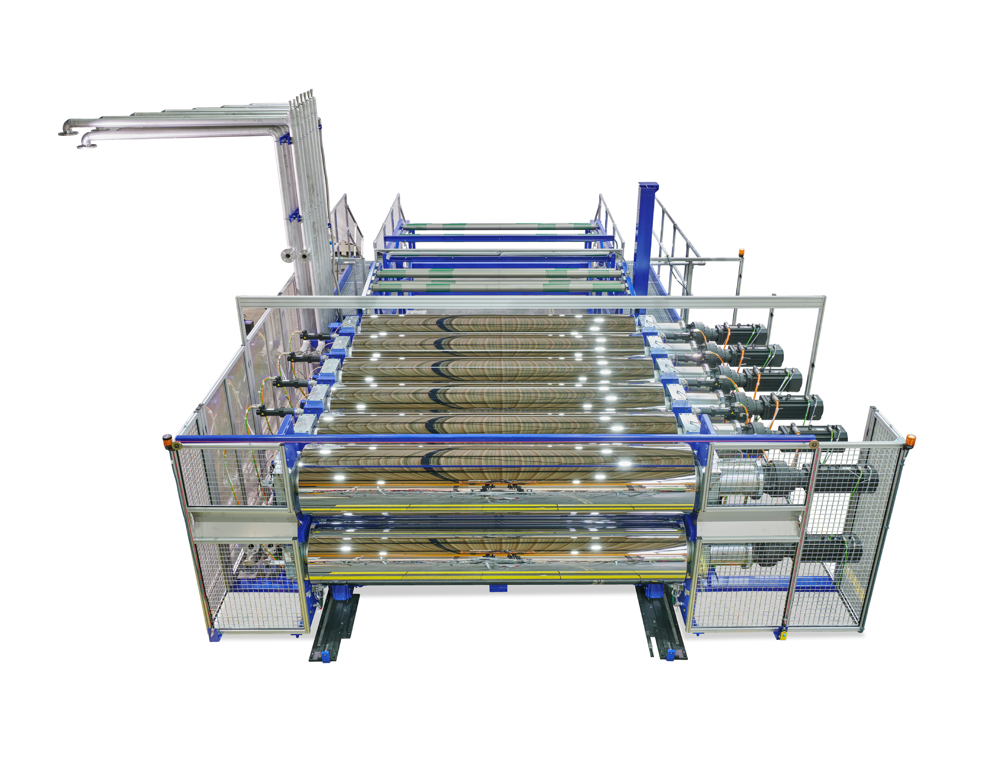 In the production of the main component, that is, the 2-to-5-mm-thick board, it is of course vital that the board is absolutely even, has a clean, ripple-free surface and complies with extremely narrow strength toler-ances. This is important for further processing as well as for its later use as floor covering. In the battenfeld-cincinnati line, the impeccable quality standard of the CERAMIN board with high filler content is primarily due to the Multi-Touch roll stack. Due to continuous contact between the board and the rolls, this device ensures perfect conditions for calibration and cooling.