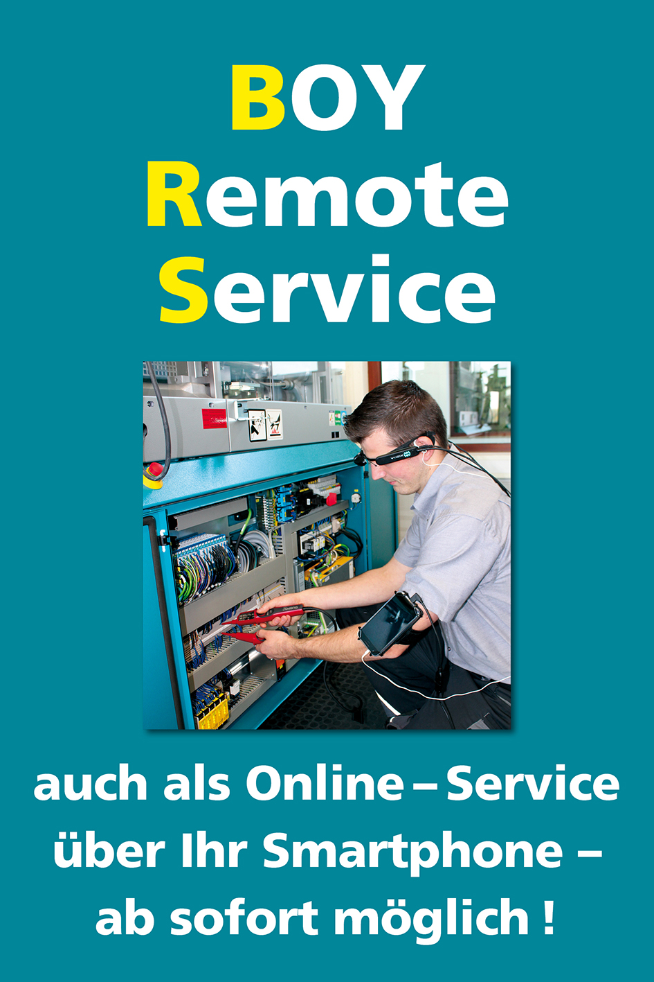 The elimination of setting problems, direct fault- or damage determination and a fast ordering of the required spare parts are thus reduced to a minimum of time with the Remote Service. The only prerequisite for this immediate assistance on site is the purchase of the necessary equipment. These are data glasses and an annual license fee. BOY has already introduced this system to some of its major customers and will soon be offering the BOY Remote Service.