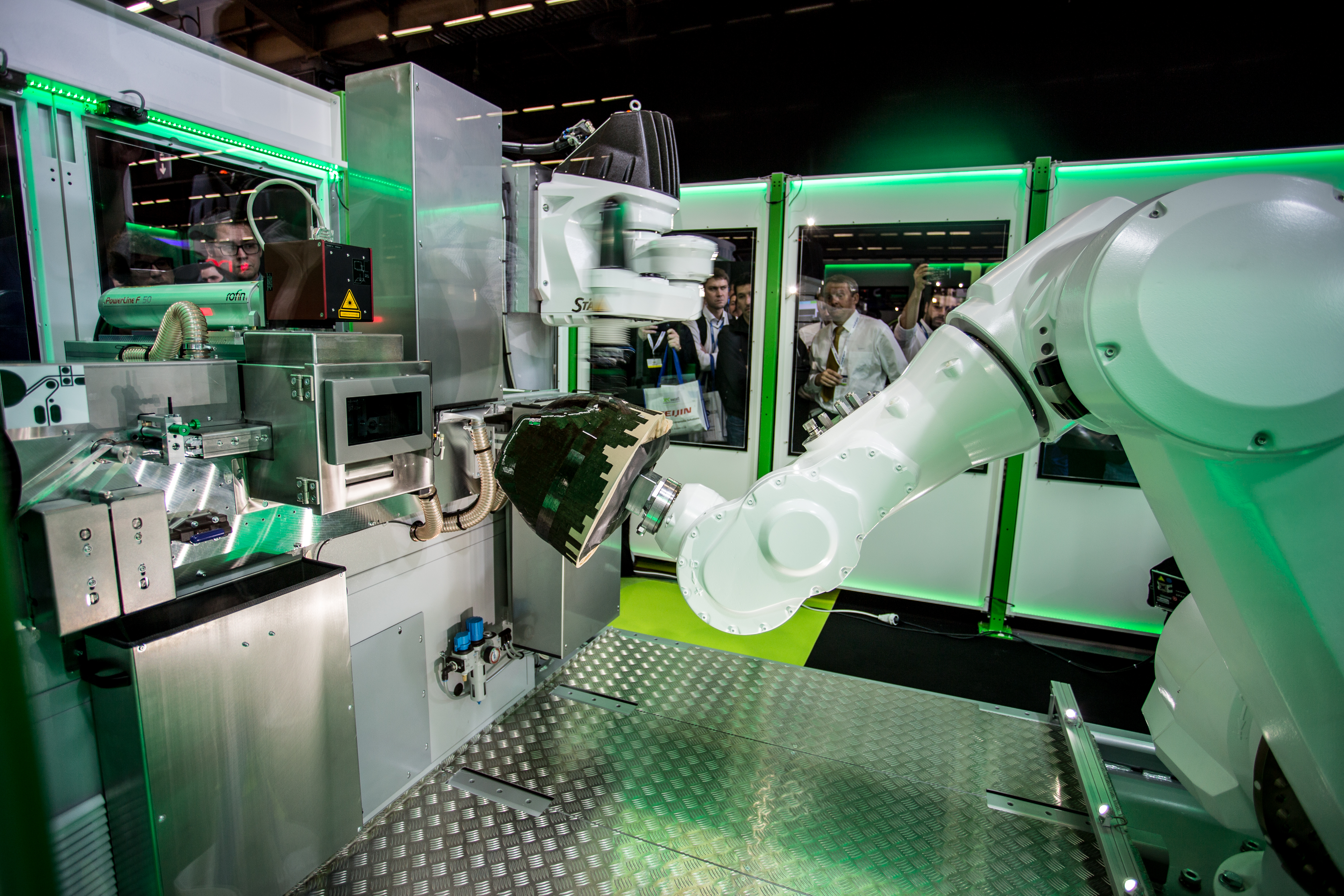 Given the scalability of the manufacturing system, Fiber Patch Placement is now available for almost every production setting. In high-volume production, the production cells process up to 15 kg of material per hour. Combined as production lines, the SAMBA Scale cells reach a constant throughput of up to 100 kg per hour, even when producing highly complex 3D-preforms. SAMBA Pro, the flexible “allrounder” of the production cells, produces complex-shaped 3D-preforms with a layup speed of 1 patch per second (2-3 kg fibers per hour), and is particularly suited for a flexible, high-volume batch production of components, given its short set-up times and rapid tool changing system. SAMBA Step, the third pre-configured system variant, is perfectly aligned with the requirements of small scale production, prototyping and R&D, also regarding its price tag. A flexible degree of automation allows the adaptation to the needs of developers. “At the moment, all systems process bindered dry carbon and glass fiber,” explains Felix Michl, CTO of Cevotec, “but we are currently testing the processing of prepreg fibers. A development in which our clients are very interested in and that attracted much attention, not only at the Composites Europe show.”