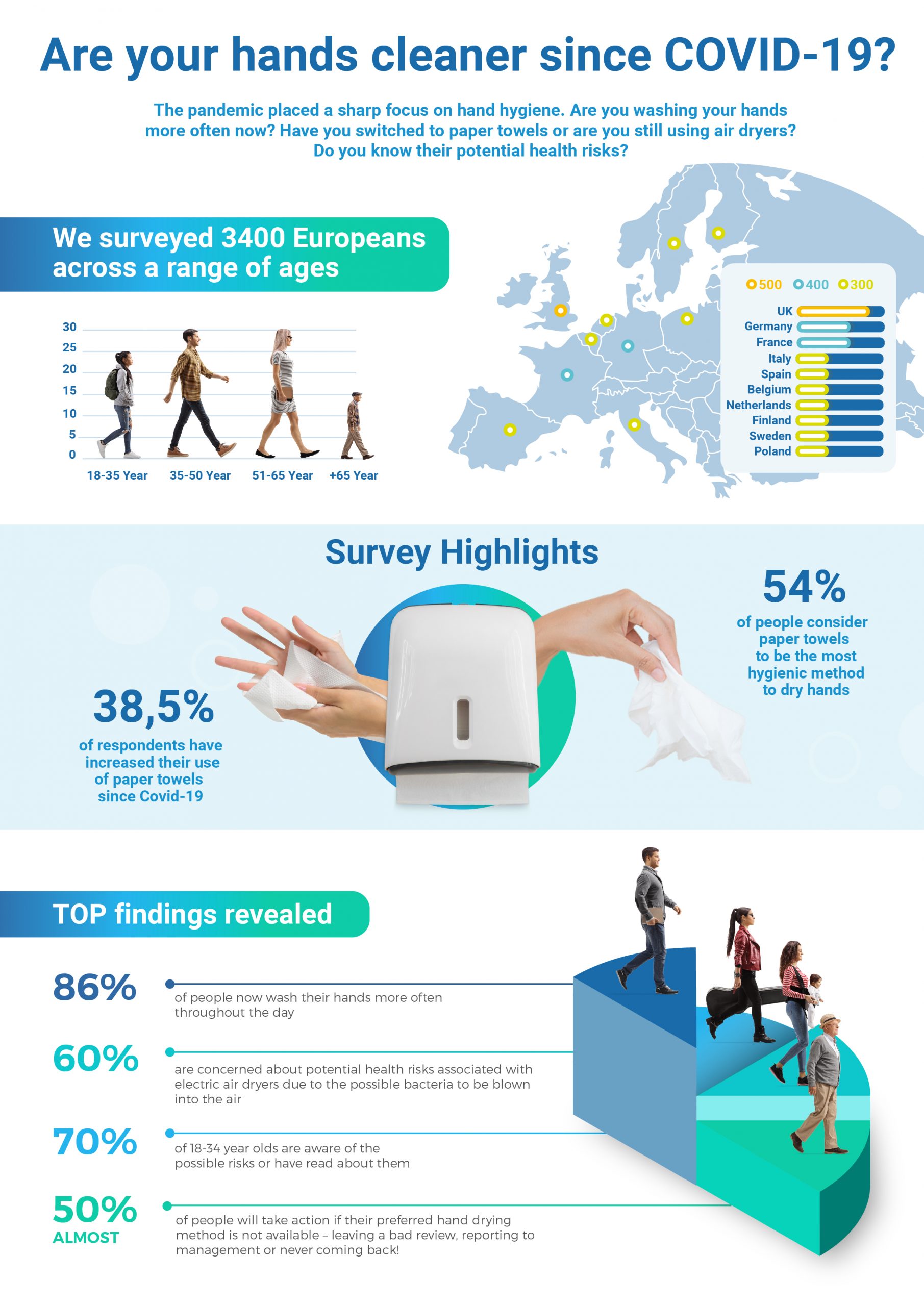 A survey has found that Europeans are more aware of the importance of proper hand washing and drying since the start of the Covid-19 pandemic. They are washing their hands more frequently and demanding paper towels for hand drying due to their excellent hygiene properties.
