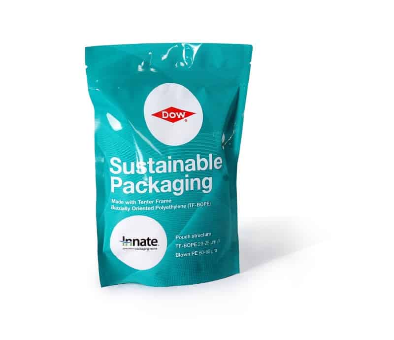 TÜV Rheinland, a leading global testing service provider, has certified that the all-PE recyclable packaging created with Dow’s INNATETM TF-BOPE emits 0.0194 kg carbon dioxide equivalent (CO2e)during its lifecycle, while traditional stand-up pouch packaging made with polyethylene (PE) and polyethylene terephthalate (PET) composite materials emits 0.0297 kg CO2e.