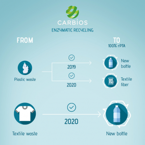 “I am very proud that we successfully transformed polyester textile waste into clear bottles, which have identical properties as those made from virgin PET. This major innovation allows us to expand our sources of supply which, until now, consisted primarily of PET plastic waste,” said Professor Alain Marty, Chief Scientific Officer of Carbios.