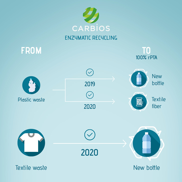 Carbios’ process enables low-value waste to be recovered and to have a new life in more challenging applications – in short, it facilitates infinite recycling of PET-based plastics and textiles. This innovative enzymatic waste recycling technology is fully in line with European objectives of creating a circular economy and strengthening environmental protection.