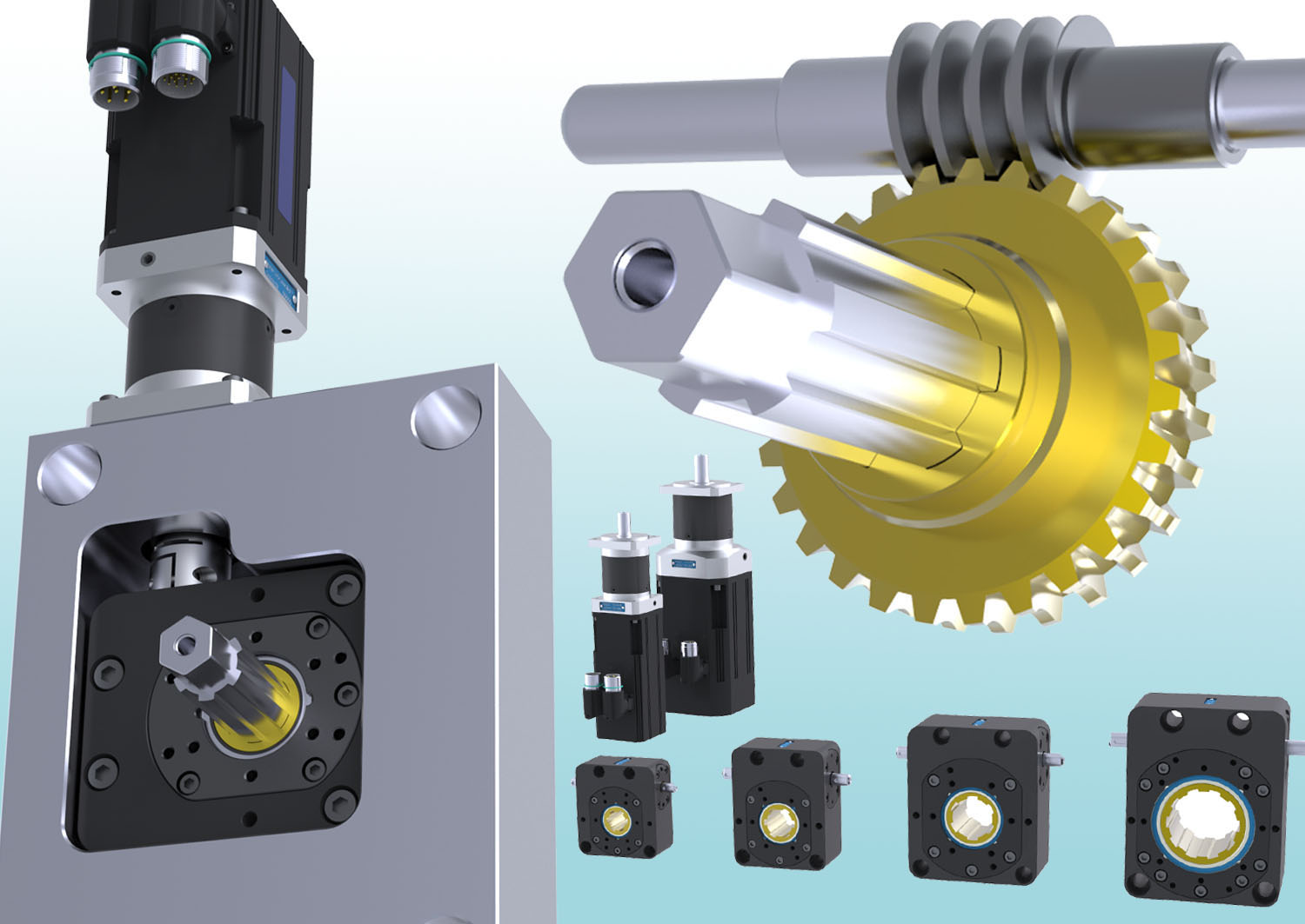 Unlike conventional devices of this type which act via reversing rack drives, i-mold’s new indexing plate drives provide unlimited rotary motion through 360 deg and beyond. This functionality offers a time-saving advantage, eliminating the need to return to a zero position before a new cycle can be started. The key to this benefit lies in the use of a system based on all-rotational action, consisting of the servo motor unit (SAK type), an elastic servo coupling (SEK type), the indexing plate drive (SID type), and the splined output shaft to the indexing plate. The worm gear principle allows a transmission of power at a 90-deg angle, thus enabling a space-saving installation of the servo motor unit on the mould.