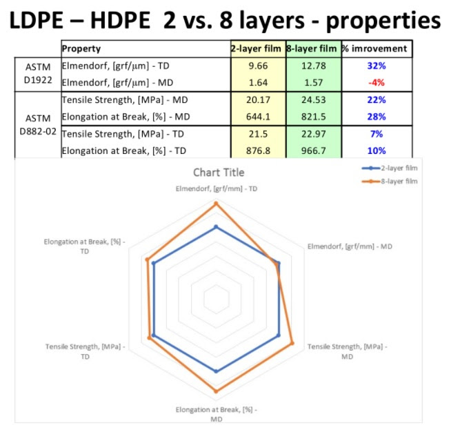 A combination of HDPE and LDPE resins showed significantly higher mechanical properties of the 8 layer film.