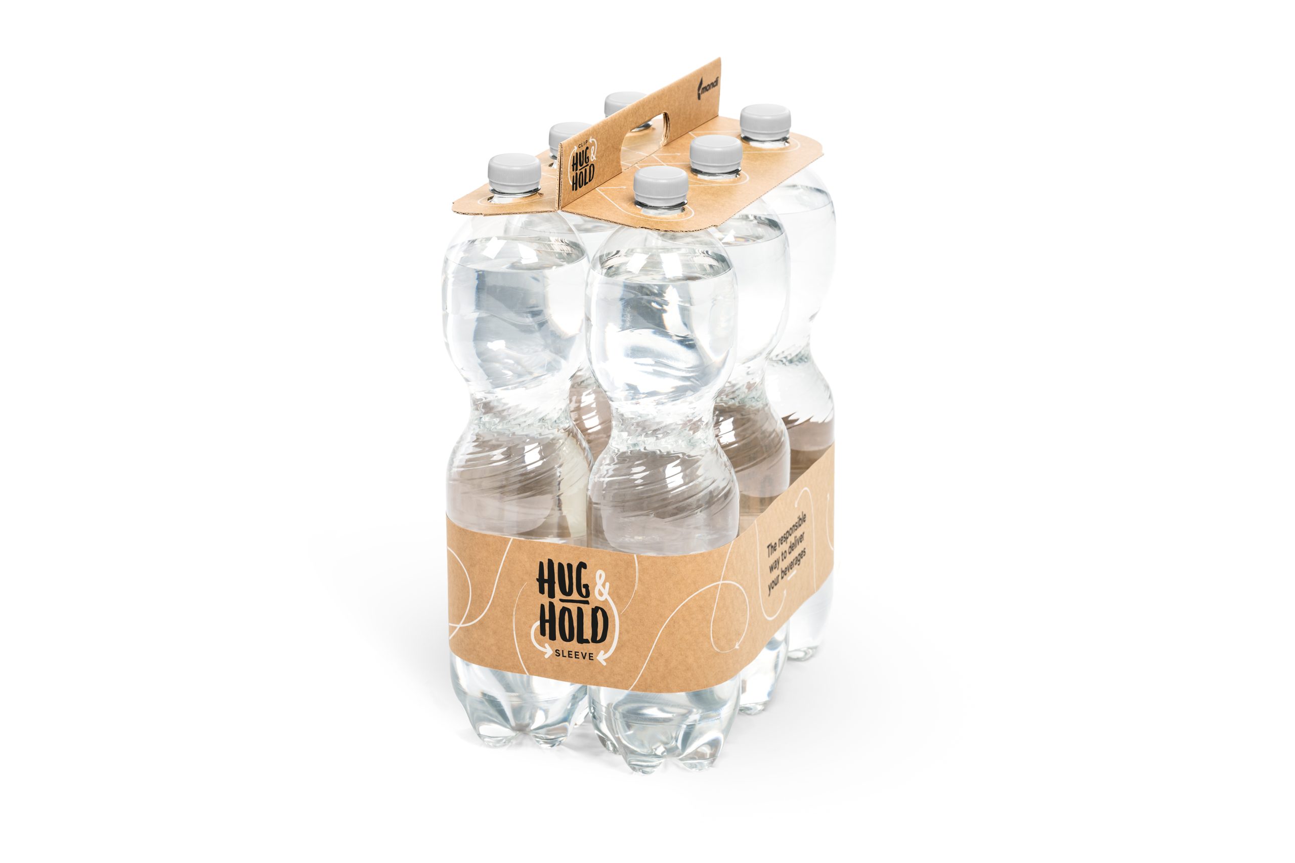 Hug&Hold is a paper packaging solution designed and developed to wrap and transport PET beverage bottles, replacing plastic shrink wrap. It is a recyclable 100% paper-based solution, comprising a kraft paper sleeve and a corrugated clip to secure the bottles and offer a comfortable handle for transportation.