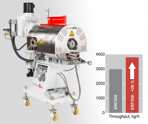 Depending on the type and level of contamination in the melt to be cleaned and the selected screen size, the ERF350 achieves a maximum throughput of 3800 kg/h in combination with the same ultra-low melt losses. It is thus positioned much higher up in the portfolio than the existing ERF250, which already impresses with a maximum throughput of 3000 kg/h. This represents an increase of around 28% for the same filtration surface and typical small footprint. This value has since been confirmed during the first few months of practical duty with pilot customers. Users profit from more productivity when recycling contaminated waste plastics from industrial or consumer sources. Furthermore, experience to date has shown that energy consumption is about as low as that of the ERF250 in spite of the far better efficiency.