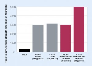 BRUGGOLEN TP-H1607 is a proprietary copper based stabilizer package which significantly extends long term mechanical property retention of polyamides to limits unmatched by existing classic copper salt based anti-oxidants. For example, tests demonstrate that it enables heat stabilization of unreinforced PA 6.6 beyond 5000 hours at 150°C, significantly outperforming conventional copper salt based stabilizers which level off at 3000 hours at this temperature. The extraordinary efficiency offers the opportunity to dramatically reduce copper and halogen content. In PA6.6 at 150°C the copper concentration in the compound was reduced by a factor of more than 5 and still matched the maximum performance level of existing copper salt based products. This capability allows cost savings and opens applications in the E&E sector, such as switch housings and sensors, where a comparative tracking index CTI of 600V is required. Significantly, trials revealed that it exhibits no greater influence on electro-corrosion than conventional phenolic/phosphite stabilisers used extensively in E&E.