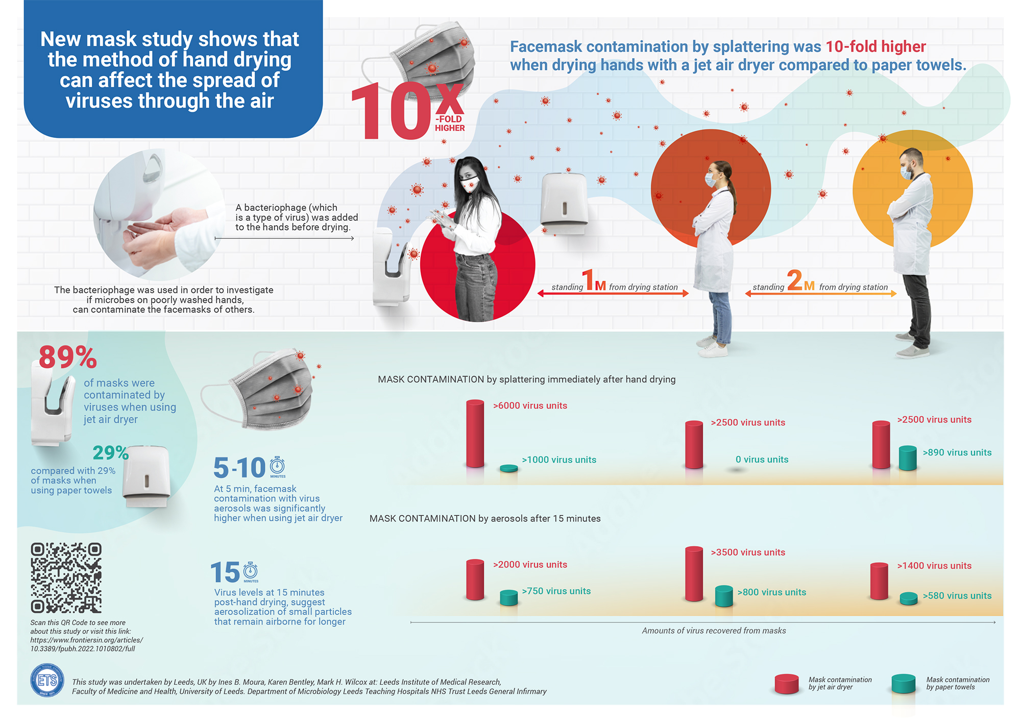 When using jet air dryers, 89% of masks were contaminated by viruses – compared with 29% of masks when using paper towels.