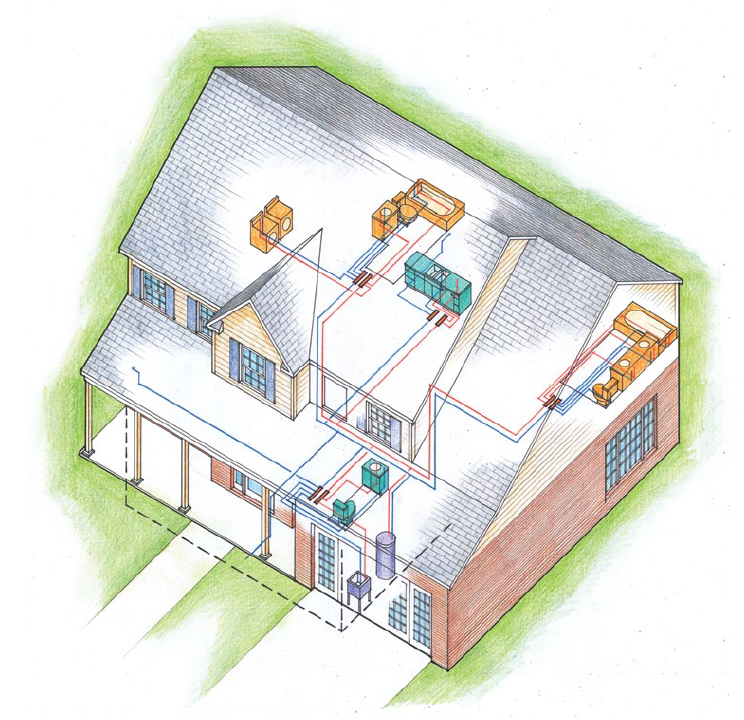 PEX plumbing systems can be installed as Trunk & Branch, Home-run, or Zoned using remote manifolds as shown in this illustration.