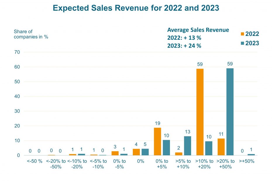 Another preoccupying situation is the slower recovery of the markets and customer demand. Compared to the survey in February 2022, less companies have noticed a recovery in demand for the business in Europe and North America. More companies then in the survey before (27 percent compared to 24 percent) used or plan to use government and Corona support programs. “For the Asian continent the demand revival is expected to take even longer. This is tough for our industry and clouds the bright outlook of +24 percent sales growth along the entire value chain for 2023”, explains Klaus Hecker.