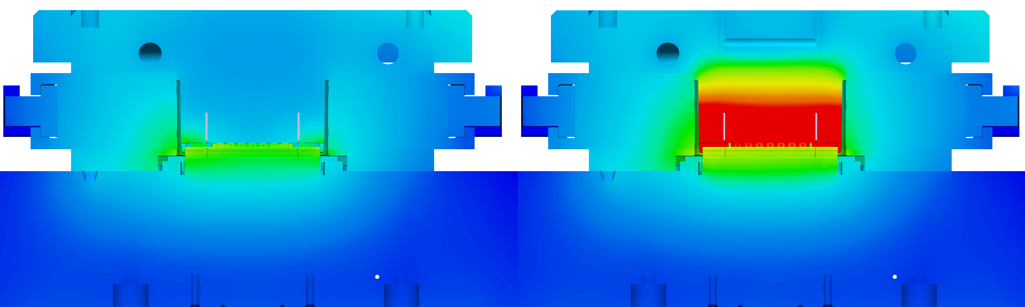 Temperature distribution just before demolding, with conformal cooling from 3D printing on the left (only visible halfway trough), and conventional cooling on the right.