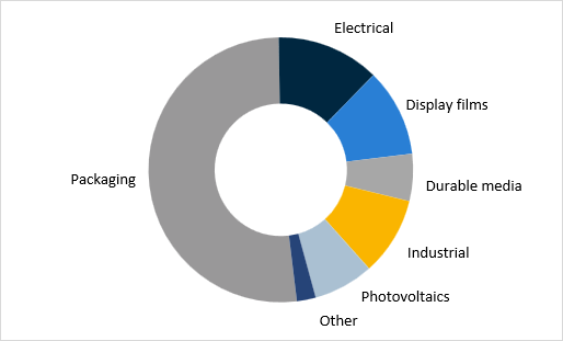 Packaging remains the largest end-use market for BOPET films and in spite of sustainability pressures, is growing strongly across developing markets and within profitable niches globally. The use of flexible packaging including BOPET film for non-food items is lower than for food providing good opportunity to switch from rigid packaging, and BOPET lids and labels in combination with PET trays and bottles offer a mono-material solution.