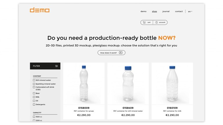 The idea of creating an e-commerce of 2D / 3D models – explains Alberto Castellan Managing Director of DEMO– was born with the aim of offering a lean and fast service , capable of reducing and simplifying the decision-making processes underlying the design of a new PET packaging .