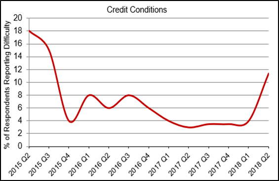 In the CES members second quarter survey, the percentage of respondents who reported that their customers were having difficulty obtaining financing for new equipment increased to 11.4 percent—a 7.4 percent increase from the first quarter, which is in sync with rising interest rates as U.S. monetary policy continues its gradual tightening. However, the remaining majority of respondents—88.6 percent reported no customer financing difficulty in the second quarter, which suggests financing rates were not cost prohibitive and financing for new plastics equipment remains largely accessible.