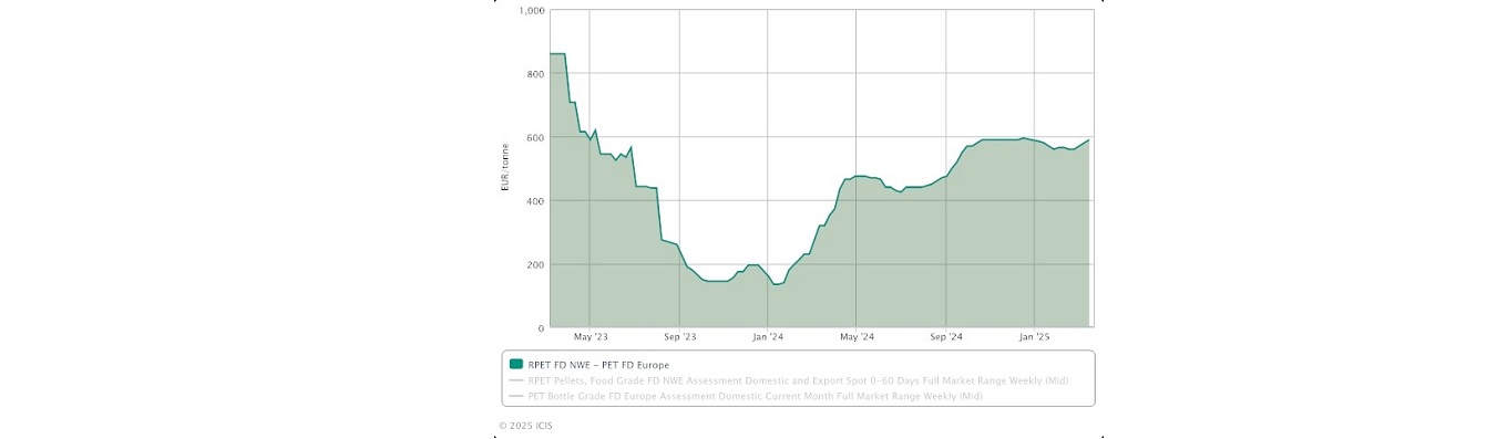 Since cost-cutting is still crucial in 2025, several firms are reducing the usage of recycled content due to spreads of about €600/ton between virgin PET, food-grade pellet (FGP), and recycled polyethylene terephthalate (R-PET).