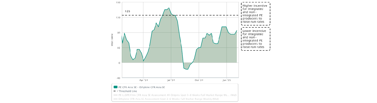 Many plants in southeast Asia plants rely on naphtha to produce ethylene (C2), which is then used to produce PE and other downstream products.