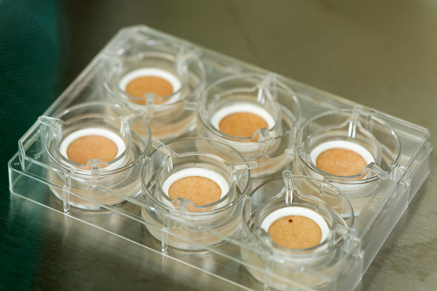 Genoskin provides a unique alternative to animal testing using excess human skin that is kept alive in testing wells. The skin is donated by patients after common plastic surgery procedures, such as tummy tucks. At the end of these procedures, any excess skin is generally disposed of by the hospital. The Genoskin team now recycles this skin into a patented testing model for cosmetic, pharmaceutical and chemical companies as well as research institutions. The retrieved skin is placed in a testing well that contains a special biological matrix to keep the skin alive for several days.