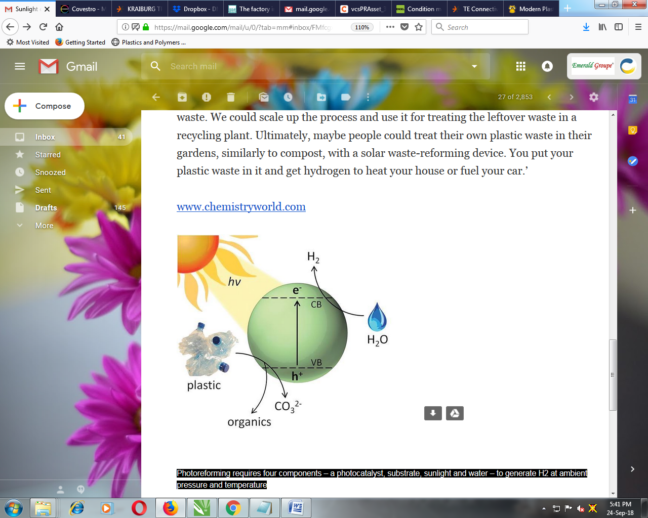 The process, called photoreforming, is simple. They drop the photocatalyst onto the plastic then immerse the plastic in an alkaline solution. Irradiation with sunlight reduces water from the solution to hydrogen while the plastic polymers simultaneously oxidise to small organic molecules. The group tested the system by photoreforming three common polymers; polylactic acid, polyethylene terphthalate and polyurethane. The results matched those of state-of-the-art hydrogen evolution photocatalysis systems that employed expensive sacrificial reagents.
