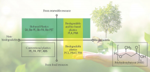 > bio-based, biodegradable plastics: PLA, PHA