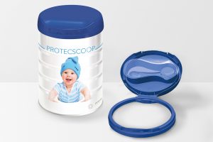 - Flip-top hinged closure whose innovative design allows one-handed preparation of feeding bottles.