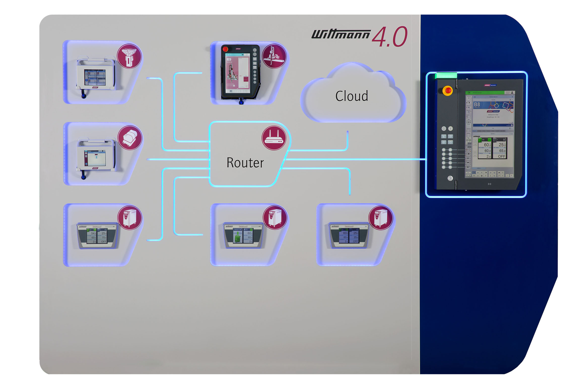 Furthermore, the integration of robots and peripherals into the new UNILOG B8 machine control system, known as WITTMANN 4.0, will be clearly shown in an easy-to-understand demonstration on an interactive display panel, giving visitors an opportunity to test the advantages of the Industry 4.0 solution from WITTMANN for themselves. It will visualize the complete integration into the UNILOG B8 machine control system of WITTMANN temperature controllers from the TEMPRO plus D series, the intelligent FLOWCON plus flow controller, a robot from the control system generations R8 and/or R9, the GRAVIMAX G gravimetric blender and, most recently, also of dryers from WITTMANN’s ATON plus series. All parameters for a mold, that is all settings required on the machine, plus various temperatures and formulations for the peripherals, as well as the robot teach program, can be administered centrally without much effort. Another major advantage is the possibility to have the visualization of the control systems of all WITTMANN 4.0-compatible peripherals and of the robot displayed on the B8 screen in their original form. This enables the operator to switch easily and efficiently between the various appliances connected to the machine.